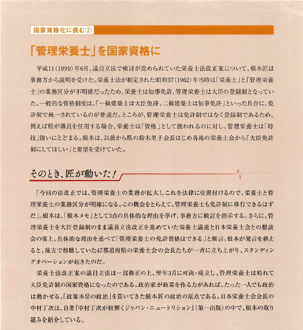 まさに管理栄養士の大臣登録制から大臣免許制として国家資格になった時のお話でした。このことは、日本栄養士会会長の中村丁次先生の自著「中村丁次が紐解くジャパン・ニュートリション」の中で根本匠先生の取組を紹介されています。(下記参照)