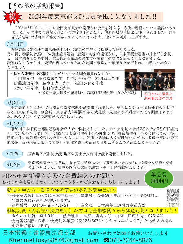 今年度第一号の連盟だより「連盟TOKYOレポート」を作成致しました。今回は上半期の活動について掲載しております。感想などお寄せいただけますと幸いです。メールアドレスは誌面にございますので、どうぞよろしくお願い申し上げます。